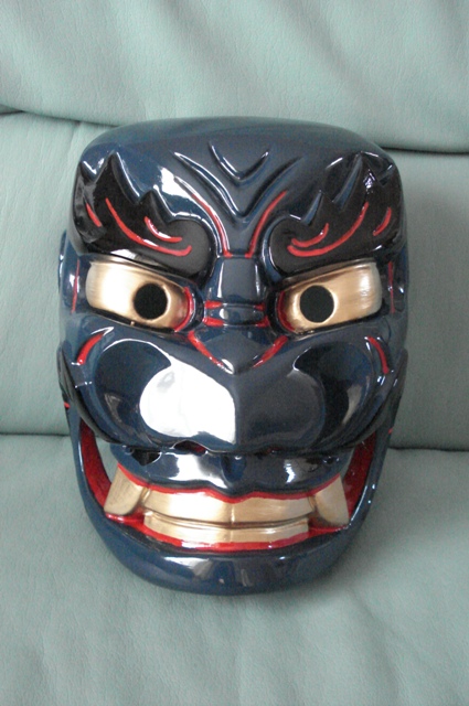 一般的な青面は緑色だったり、明るめの青だったりだが 今回はカシューの青そのままで塗った。 渋い。 夜であれば黒面に間違えるかもしれぬ。 だが、眉を黒にしたゆえ、暗闇でも微妙な陰影ができる。 この色の青面は見たことがない。 非常に気に入った。 今度は赤を小豆色で塗ってみよう。 |